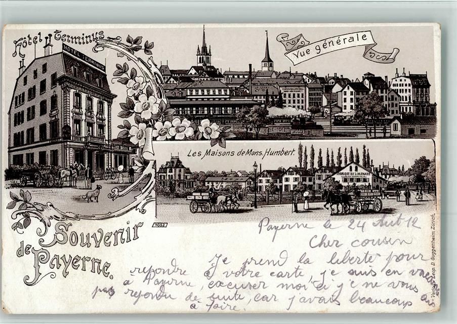 1530 Payerne 1912 BOAKC Hotel Terminus Kutsche Lithographie