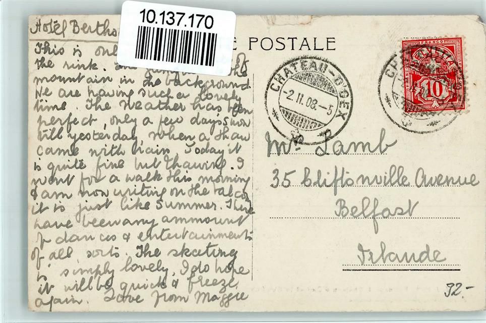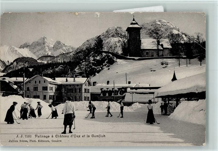 Château-d´Oex, Verlag J.J. 7532 Winter - Touristen spielen Eishockey - Patinage a Chateau d`Oex et la Gumfluh