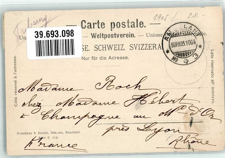 1700 Fribourg Freiburg 1905 - Quartier de l´Auge Bahnpost Zug 1064 Strecke 3 Briefmarke auf Vorderseite
