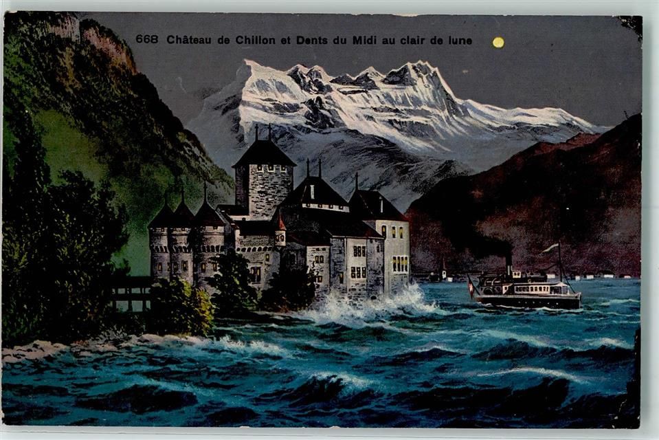 1820 Veytaux - Schloss Chillon Dents du Midi im Mondschein