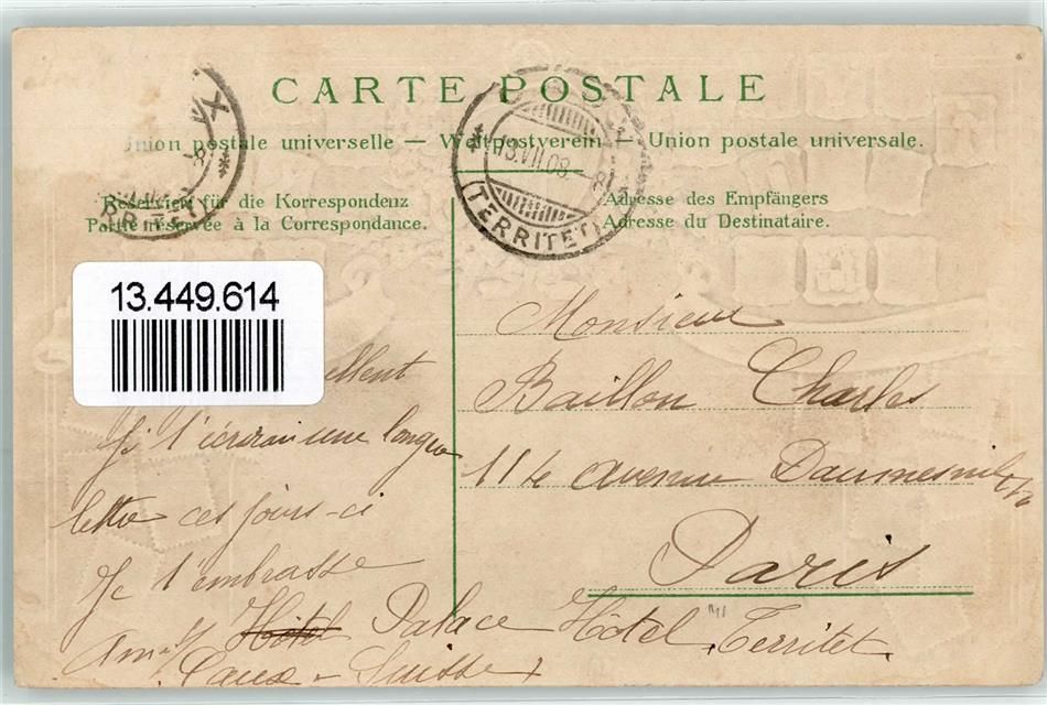 1824 Caux 1908 Prägedruck Palace Hotel Wappen Eichenblatt Horn Schleife Kranz Blumen Briefmarkenabbildungen