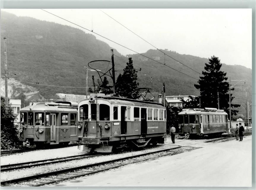 Monthey, Repro Der letzte alte Bergbahn Triebwagen der AOMC BCFeh 4/4 6 beim Abholen der SeTB BDe 4/4