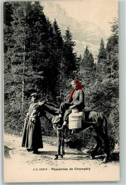 1874 Champéry Gebrauchsspuren 2 junge Walliserfrauen mit Milchkanne auf Pferd
