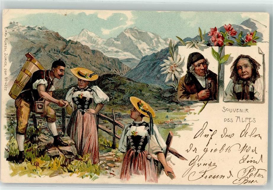 1900 Lithographie Souvenier aus den Alpen Pfeife Trachten