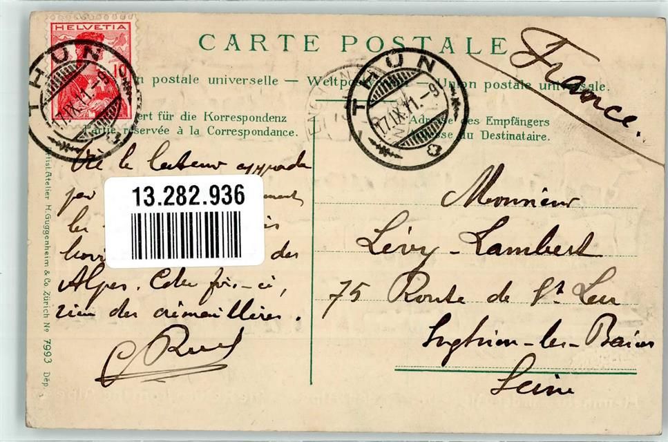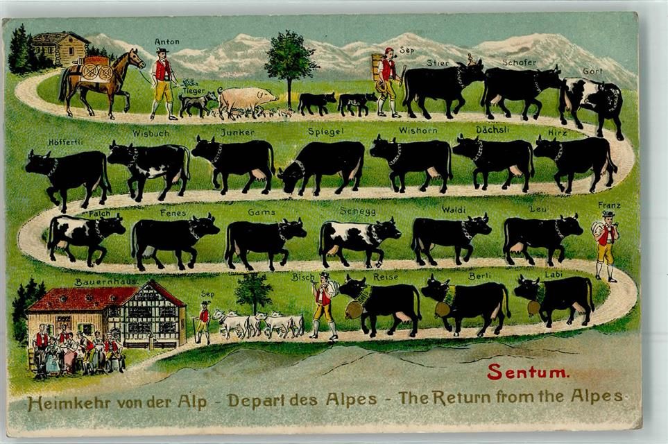 1911 Prägedruck Heimkehr von der Alp Sentum Kühe Schweine Bauer Bauernhaus