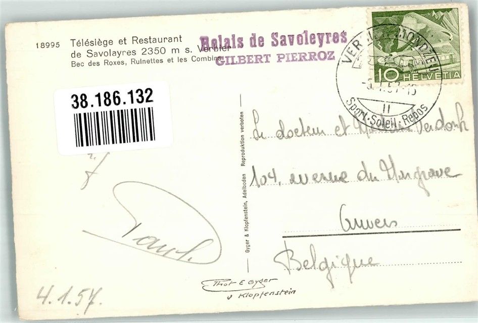 1936 Verbier 1957 Winter Gasthaus Téléslége Savolayres Briefmarke Bildseite