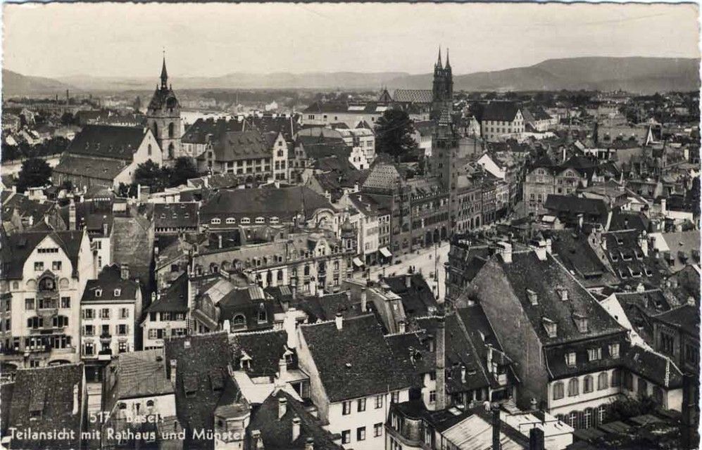 1949 - Basel, Schweiz, Teilansicht mit Rathaus und Münster,Gebr. Frey AKU1