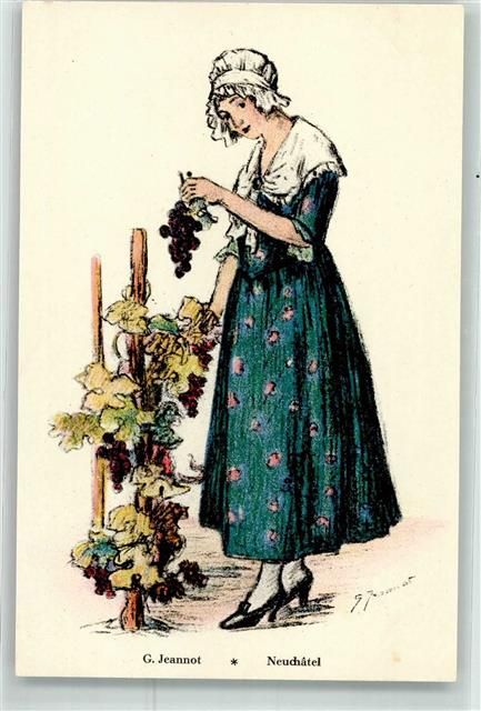 Neuchâtel, sign. G. Jeannot Frau pflückt Weintrauben Schw. Trachten-und Volkslieder-Vereinigung sign. Jeannot