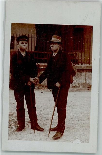 2072 St-Blaise 1910 Privatfoto AK Junge Männer Spazierstock Rucksack Winter Ort lt. Stempel