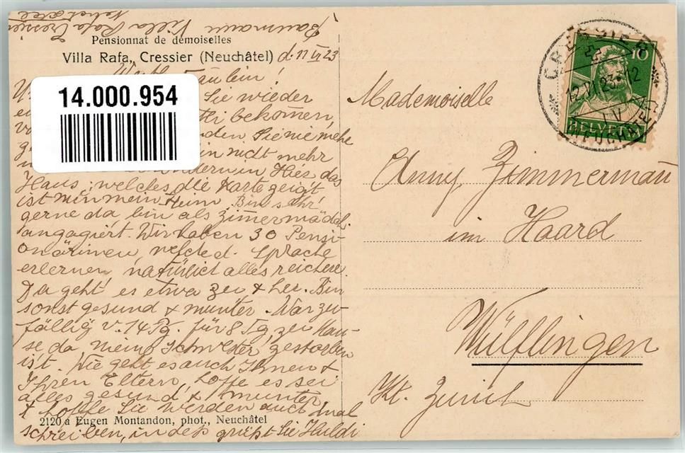 2088 Cressier NE 1923 Foto AK Pensionnat de demoiselles Villa Rafa