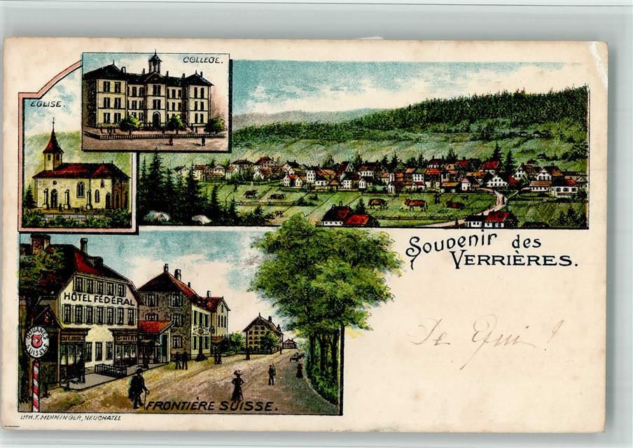 Les Verrières, Lithographie Kirche Eglise College Frontiere Suisse Grenze Hotel Federal