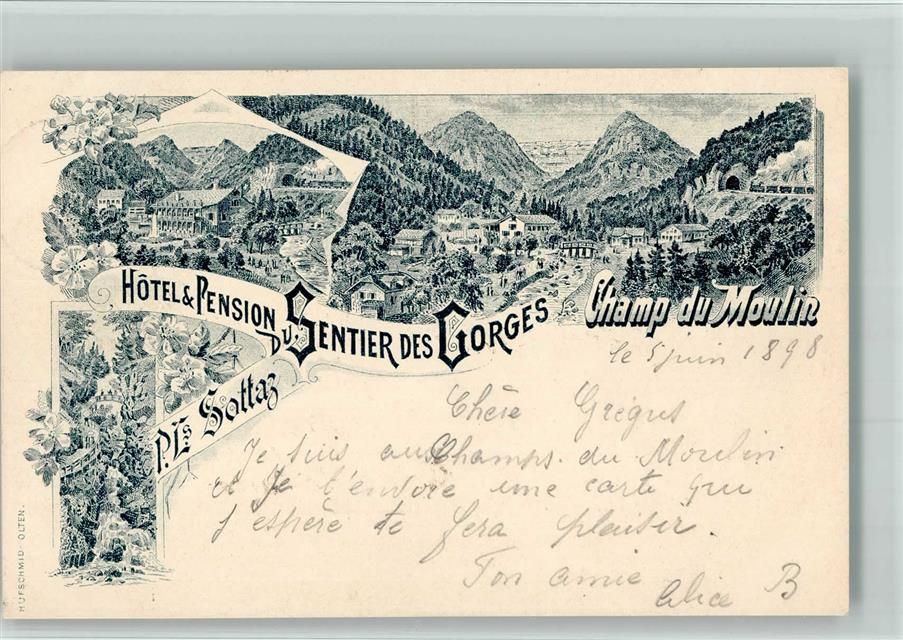 Champ-du-Moulin, Vorläufer Druck um 1890 Pension Sentier des Gorges Lithographie