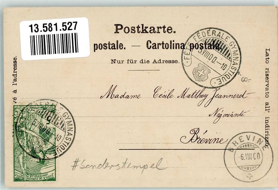 2300 La Chaux-de-Fonds 1900 Sonderstempel Fete Federale Gymnastique Jugendstil