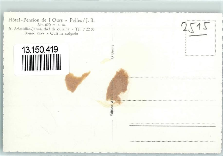 2515 Prêles Karte beschädigt Hotel Pension de l'Ours et Parc-Auto