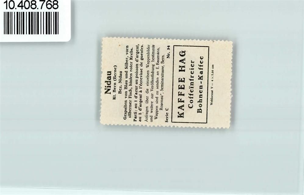 Nidau, Vignette Wappen Kaffee Hag ca 1920-1940 Fisch Krebs