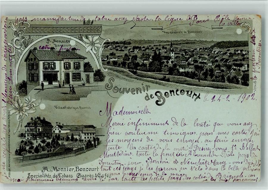 Boncourt, Lithographie/Mondschein A. Monnier Boncours Geschäft Villa Fabrique Burrus Leim löst sich Gebrauchsspuren, bitte Scan genau beachten!