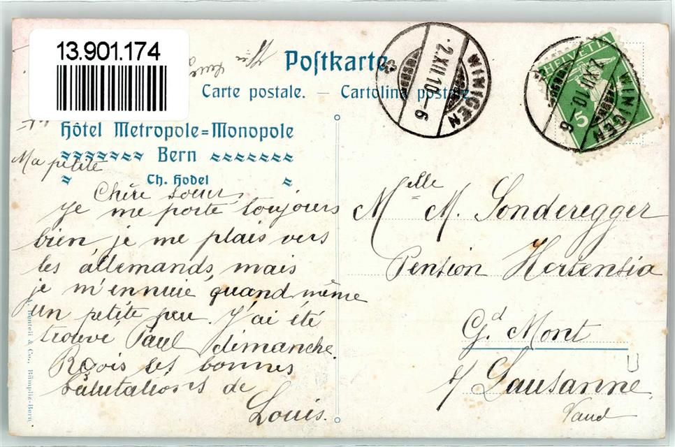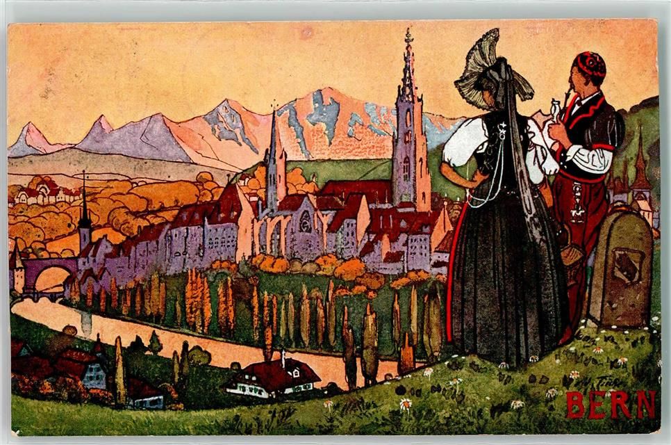 Bern, sign Ad. Fiscke Trachtenpaar Pfeife Werbung Hotel de France & Terminus A. Eleury