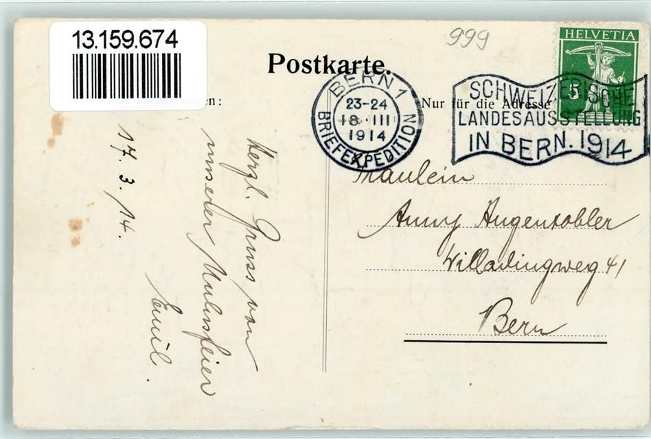 Bern, Mulus 1914 Handel I a AK Ort lt. Stempel