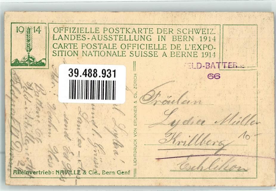 Bern, Landesausstellung 1914 Nr. 54 Feldpost Feldbatterie 66