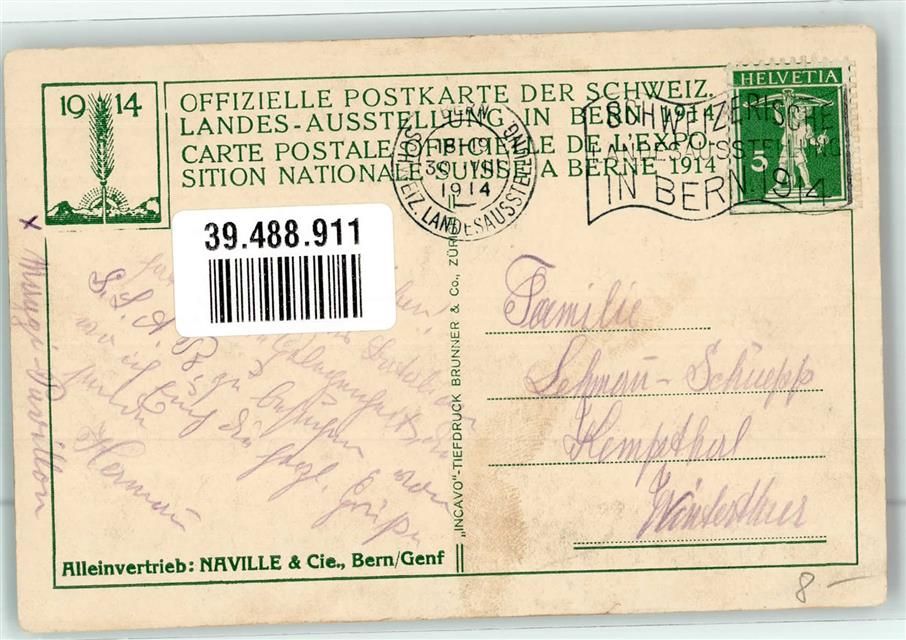 Bern, Landesausstellung 1914 Nr.67 Schokoladenindustrie Architek Polak und Piolenct Ausstellungsstempel