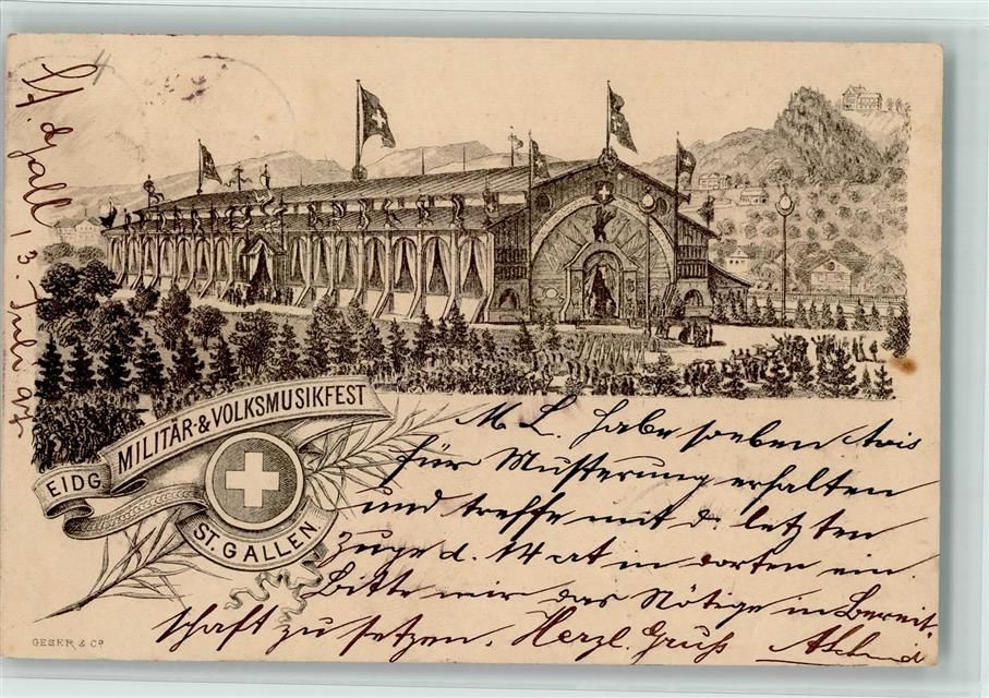 3000 St. Gallen Lithographie Militär Volksmusikfest 1897 Festhalle