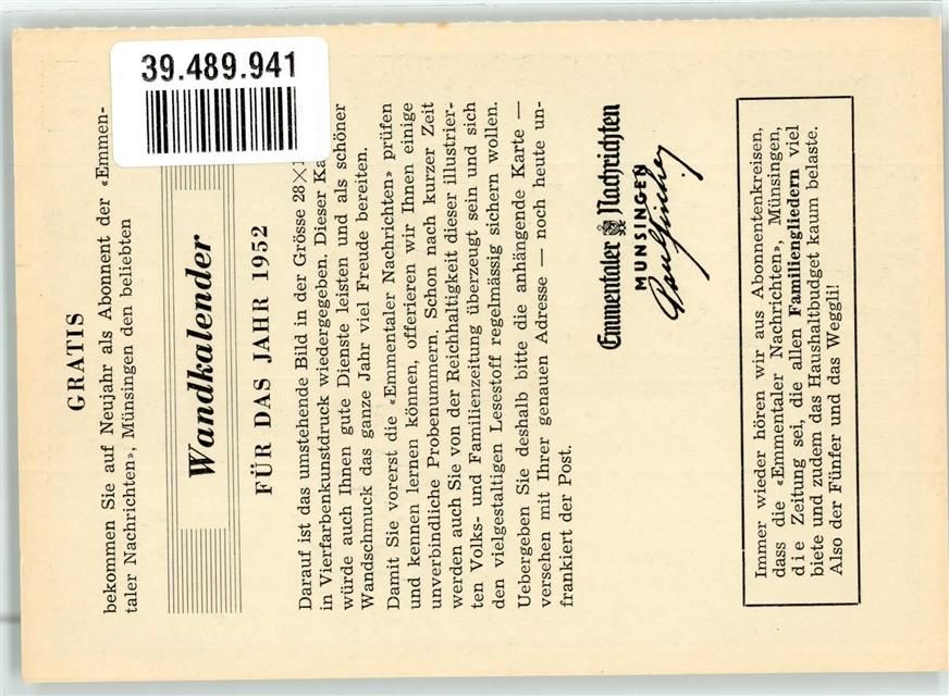 3110 Münsingen KEINE AK Winter Schweizer Wandkalender 1952 Werbung Emmentaler Nachrichten