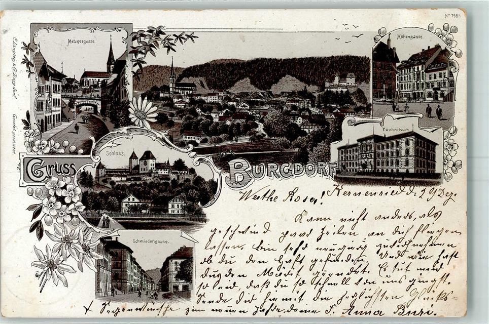3400 Burgdorf Berthoud 1899 Lithographie Metzgergasse Schloss Schmiedengasse Hohengasse Technikum
