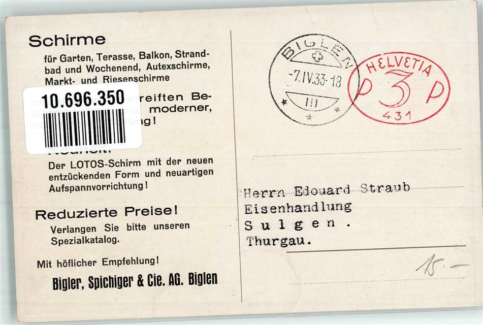3507 Biglen 1933 - Schwimmbad Handlung Bigler,Spichinger und Cie Schirme