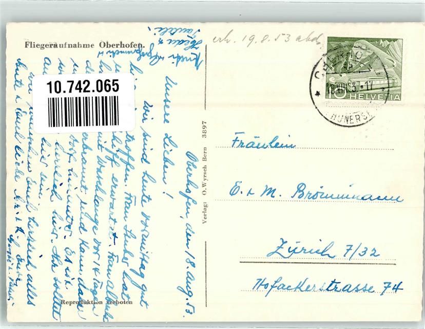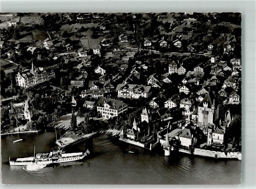3653 Oberhofen am Thunersee 1953 Foto AK Fliegeraufnahme Dampfschiff Hafen