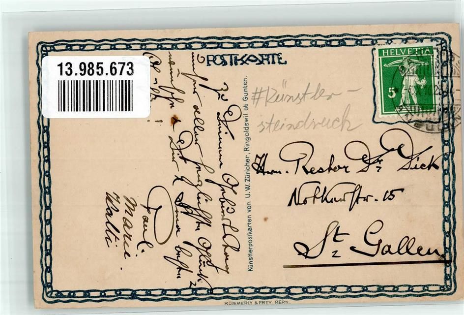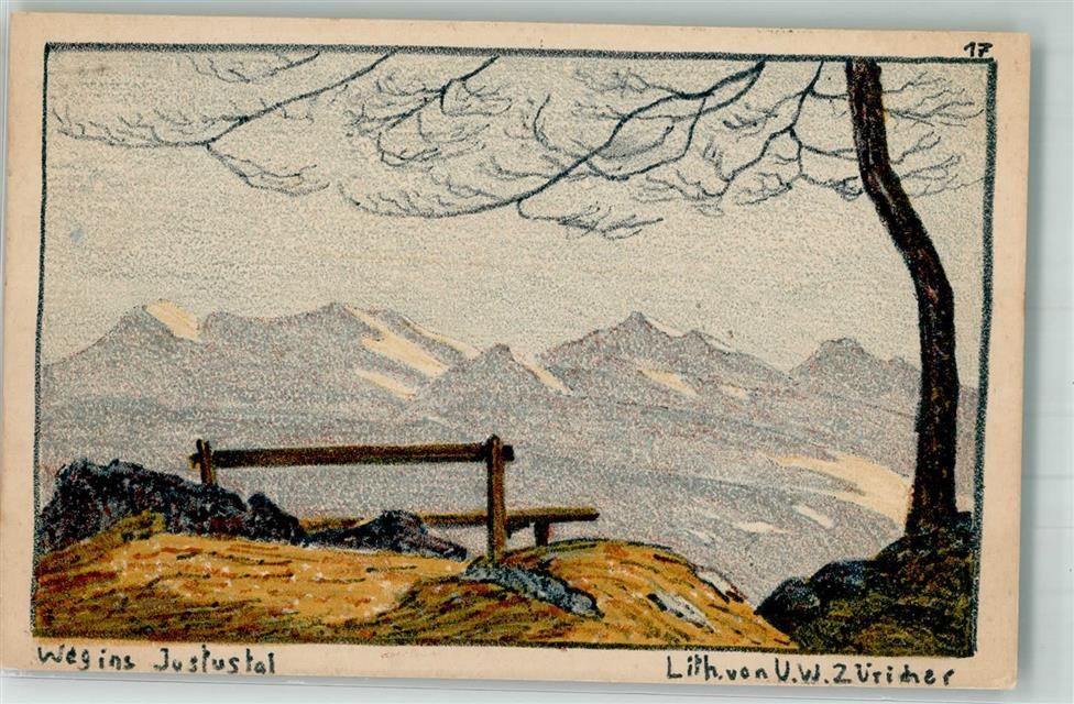 3655 Sigriswil 1916 Künstlersteindruck sign. Züricher, V.W. Justustal Bahnpost Zug 2544