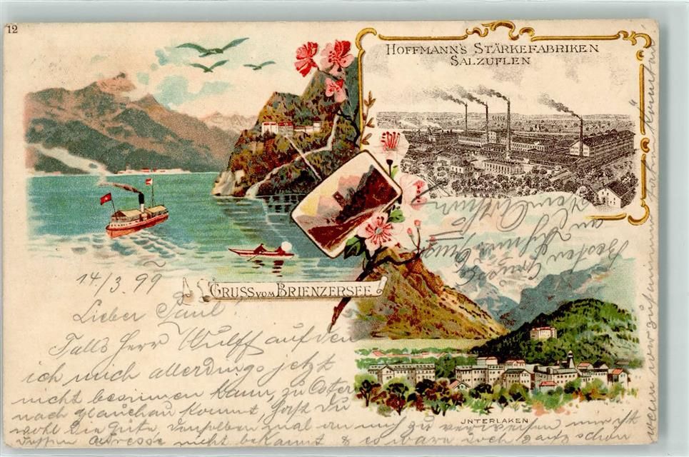 3800 Interlaken 1899 Lithographie Hoffmann´s Stärkefabriken Salzuflen Schornstein Rauch Brienzersee Ruderboot Dampfer
