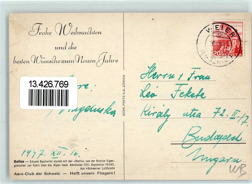 3823 Eigergletscher Lithographie Ballon Stella Eduard Spelterini Aero-Club der Schweiz - Helft unsern Fliegern!