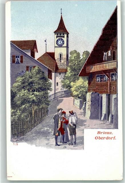 3855 Brienz BE Lithographie Oberdorf Kirche Uhr Mann Frau Tracht
