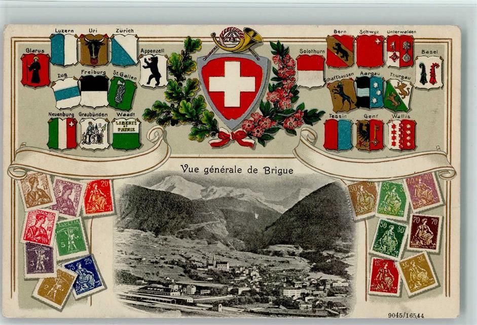 3900 Brig Lithographie / Prägedruck Passepartout Wappen Briefmarkenabbildungen