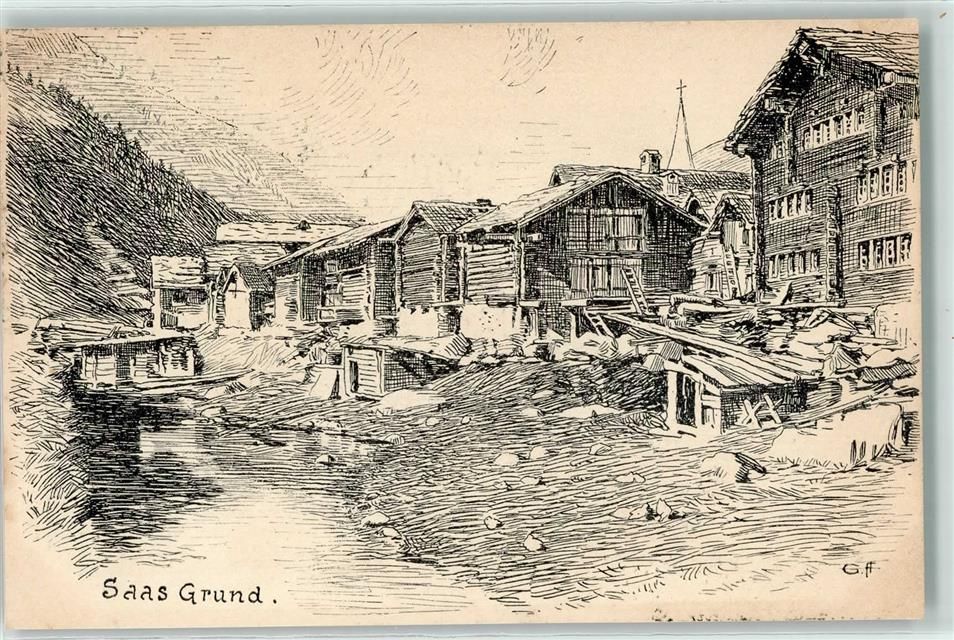 3910 Saas-Grund 1900 Künstlerkarte Chalets sign. G ff