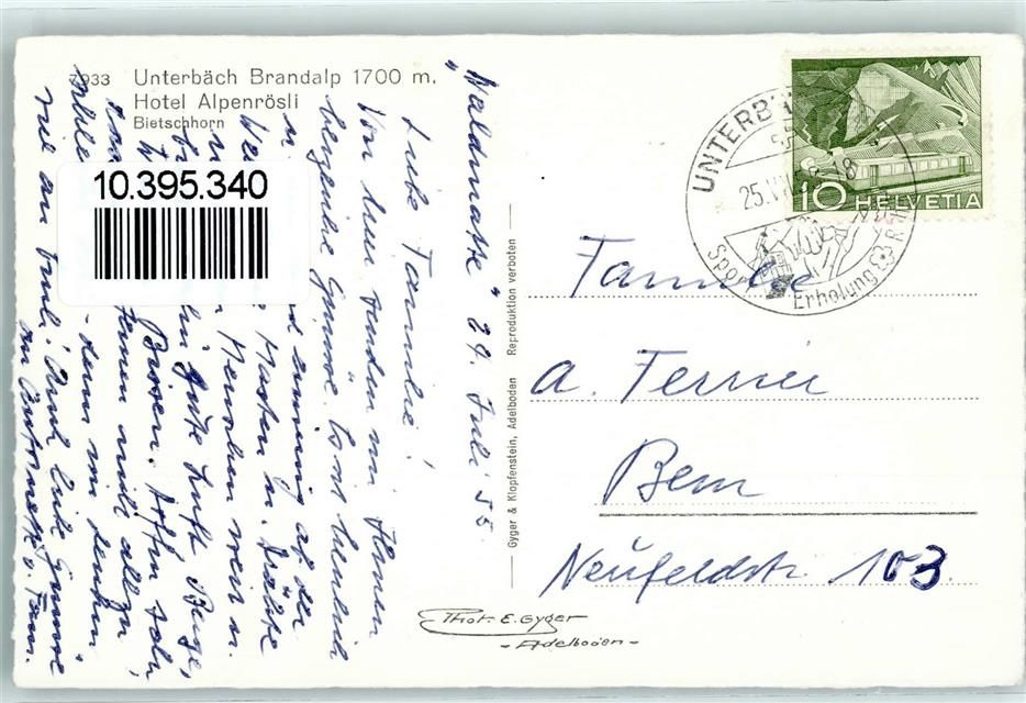 3944 Unterbäch VS 1955 - Brandalp Hotel Alpenrösli Bietschhorn
