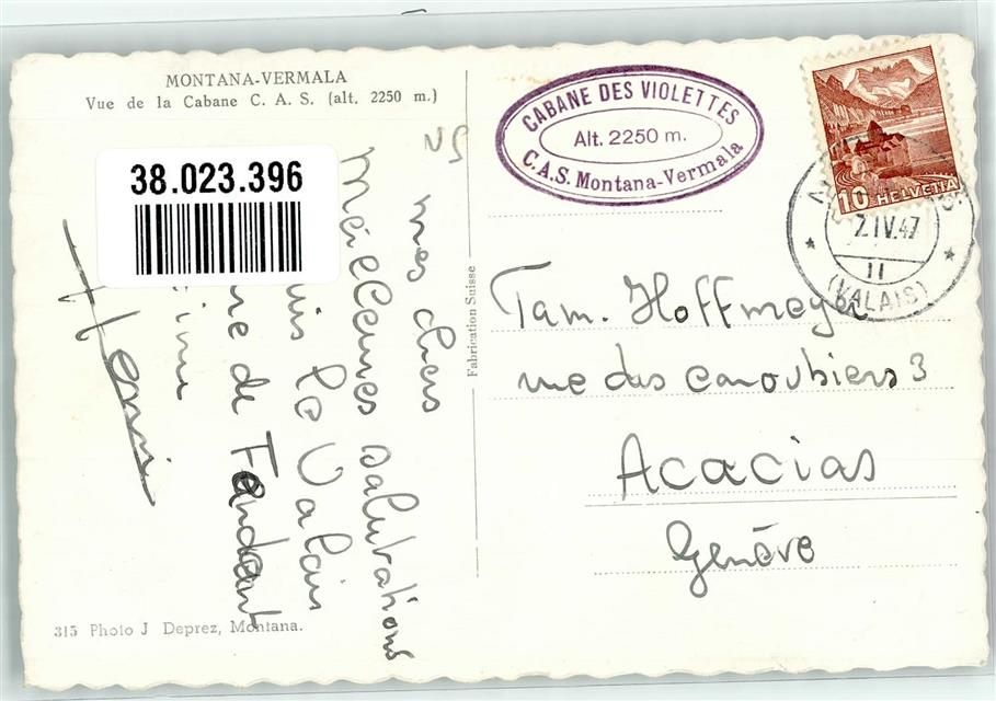 3963 Montana 1947 Winter Hüttenstempel Cabane des Violettes