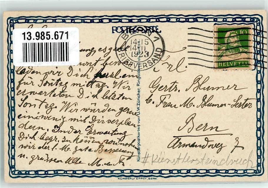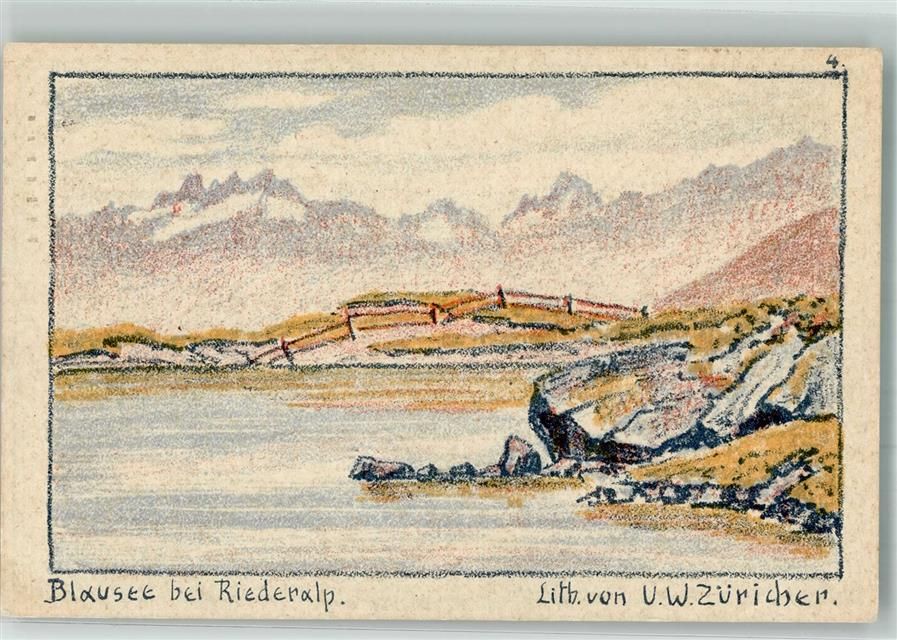3987 Riederalp 1923 Künstlersteindruck sign. Züricher, V.W. Blausee