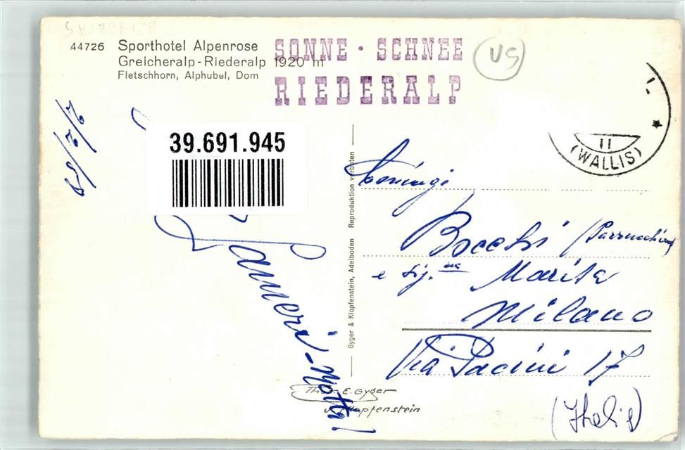 Riederalp, Winter Hotel Alpenrose Hüttenstempel Foto Gyger