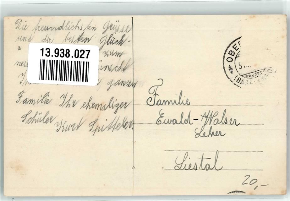 4104 Oberwil BL Foto AK Die herzlichsten Glückwünsche zum neuen Jahre Glocke Blätter Haus Ort lt. Stempel