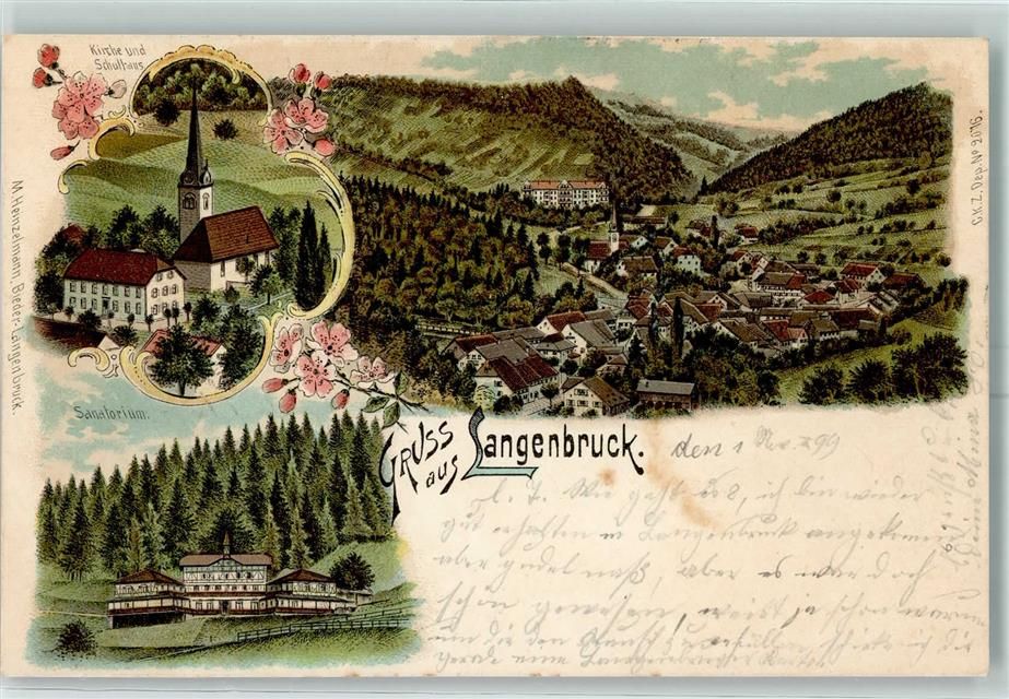 4438 Langenbruck 1899 Lithographie Kirche Schulhaus Sanatorium