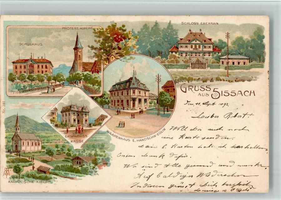 Sissach, Lithographie Schulhaus Protest. Kirche Schloss Ebenrain Warenhaus E. Handschien-Eglin Ersparniss-Kasse Kath. Kirche