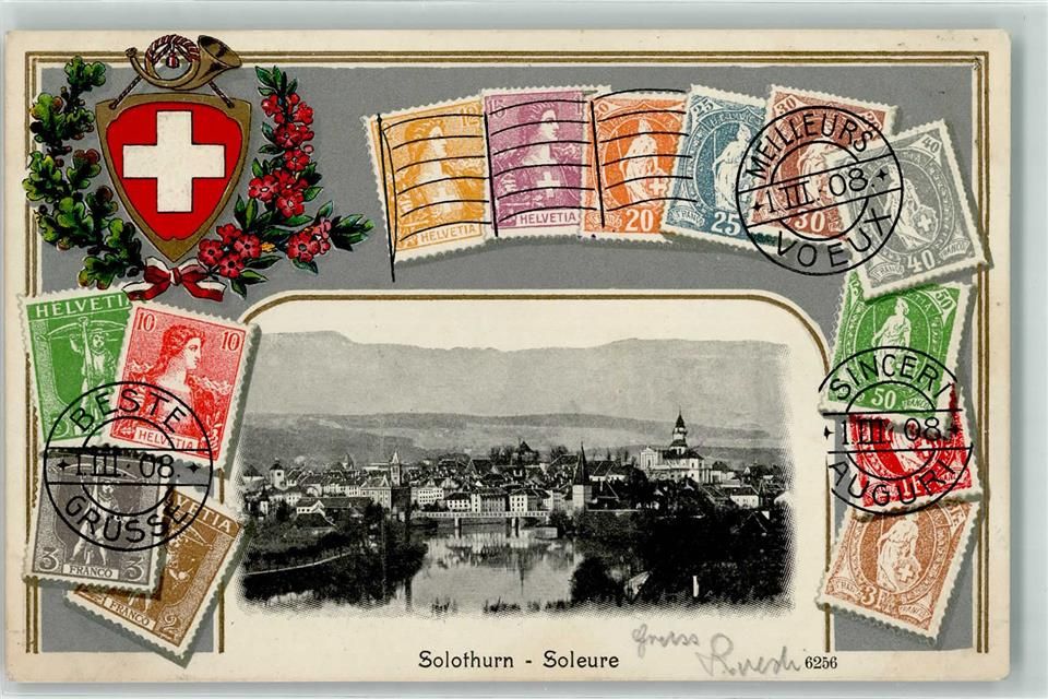 4500 Solothurn Soleure 1908 Prägedruck Wappen Horn Eichenblatt Blumen Kranz Briefmarkenabbildungen Brücke