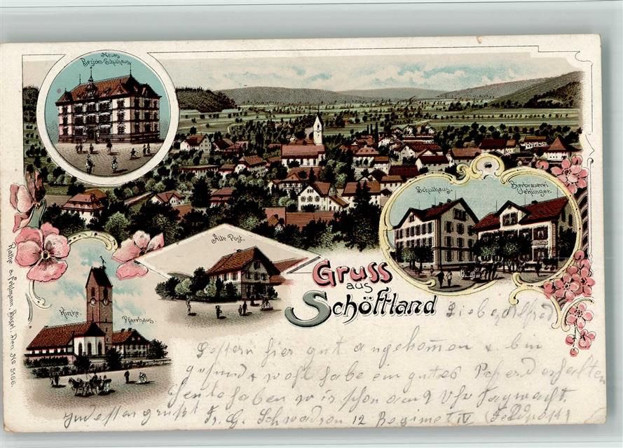 Schöftland, Lithographie Neues Bezirks Schulhaus Kirche Pfarrhaus Alte Post Schulhaus Bierbrauerei Uehlinger