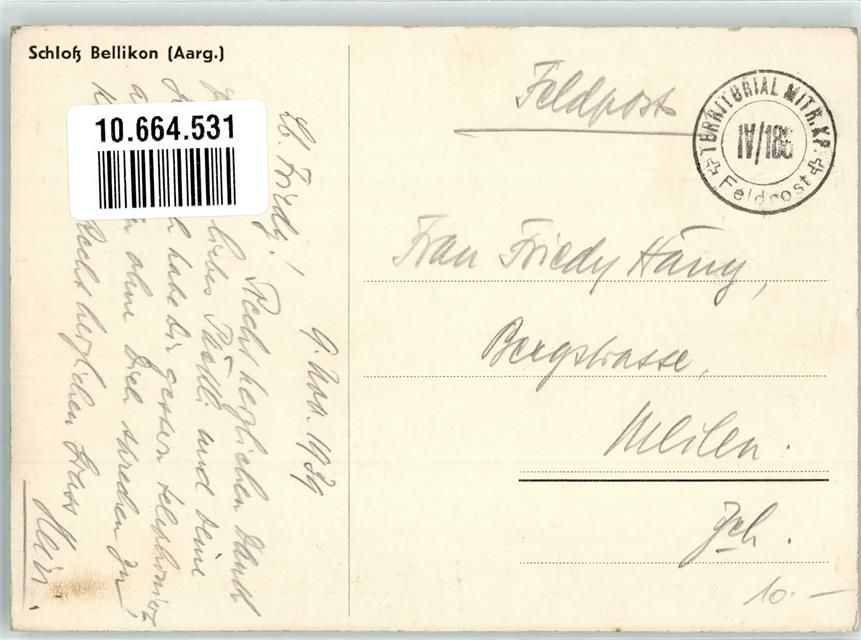 Bellikon, Schloss Bellikon Zeichnung sign. Kovasits Feldpost Territorial Mitr.Kp.