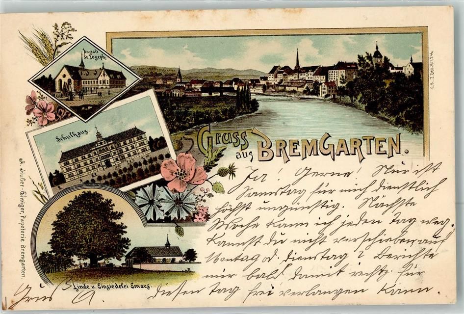 5620 Bremgarten AG 1898 Lithographie Anstalt St. Joseph Schulhaus Linde Einsiedelei Emaus Klatschmohn