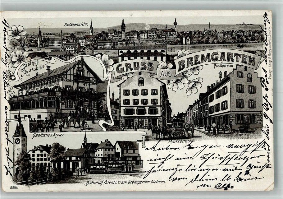 Bremgarten AG, Gasthaus Reussbrücke Gasthaus z, Kreuz Postamt Lithographie