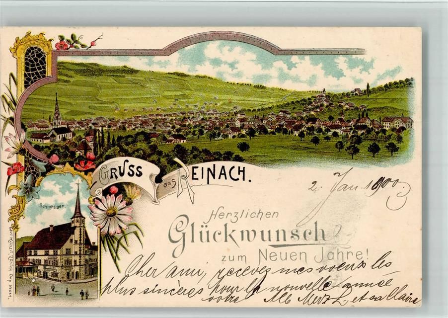 Reinach AG, Lithographie Schneggen Glückwunsch Neujahr Verlag Künzli Nr 681