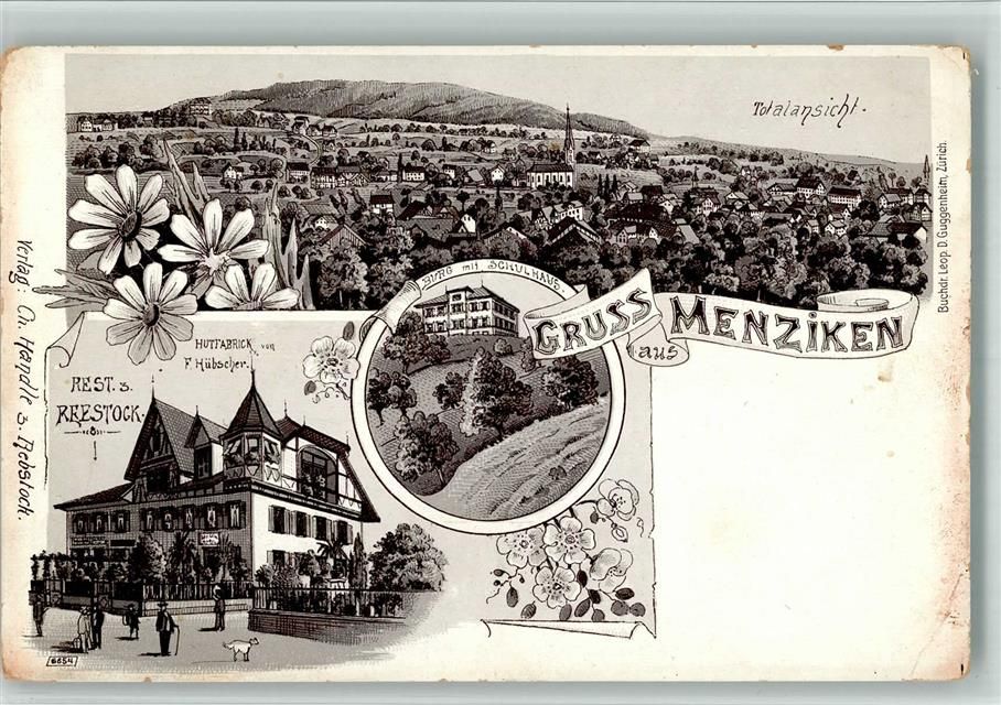 Menziken, Lithographie Gasthaus Zum Rebstock Hutfabrik F. Hübscher Burg mit Schulhaus Gebrauchsspuren, bitte Scan genau beachten!