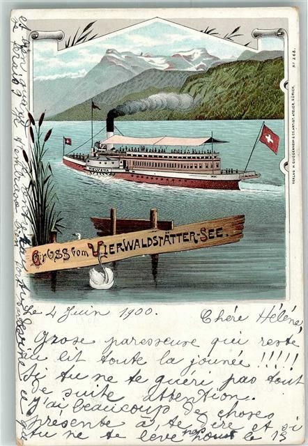 6000 Luzern Lucerne 1900 Lithographie Vierwaldstättersee Schwan Seitenraddampfer Helvetia Ort lt. Stempel